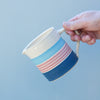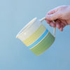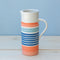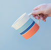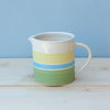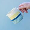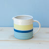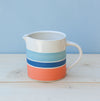 Each jug is decorated with three bands of coloured porcelain slip, brushed on by hand with precision and care. The handle, with its distinctive circular design and button detail, gives the piece its unmistakable character.